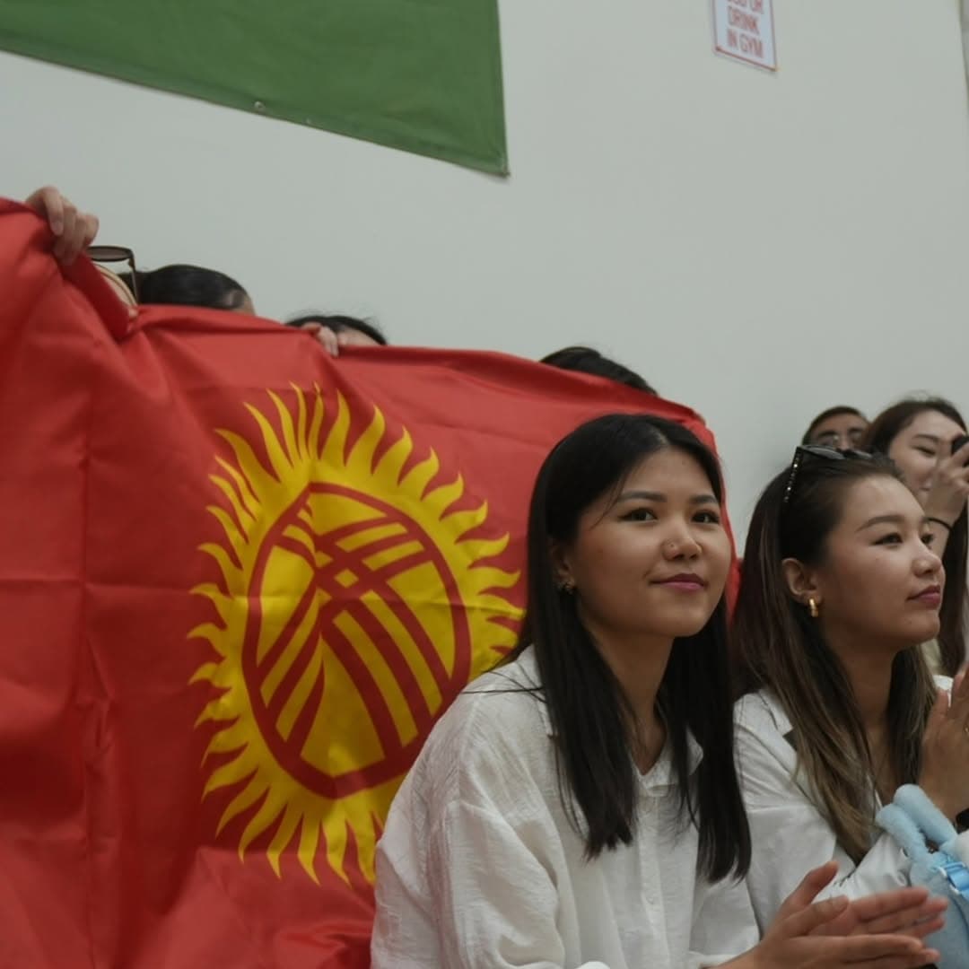 Supporters display the Kyrgyz flag courtside, bringing energy and national pride to the volleyball matches at the 2025 Mini Olympics.
