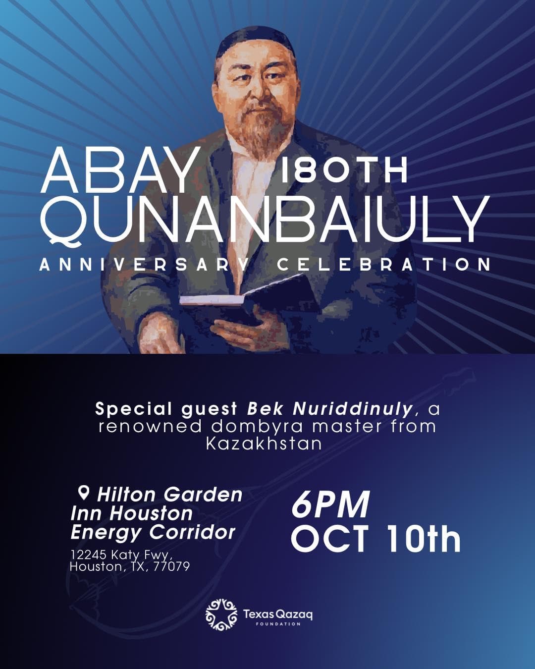 On October 10, Houston will host a public celebration honoring the 180th anniversary of Abay Qunanbaiuly, the poet, philosopher and composer whose writings continue to shape Kazakhstan’s moral and intellectual life. Organized by the Texas Qazaq Foundation, the evening will bring together community members, scholars and local leaders for a program of music, poetry and reflection on Abay’s legacy.