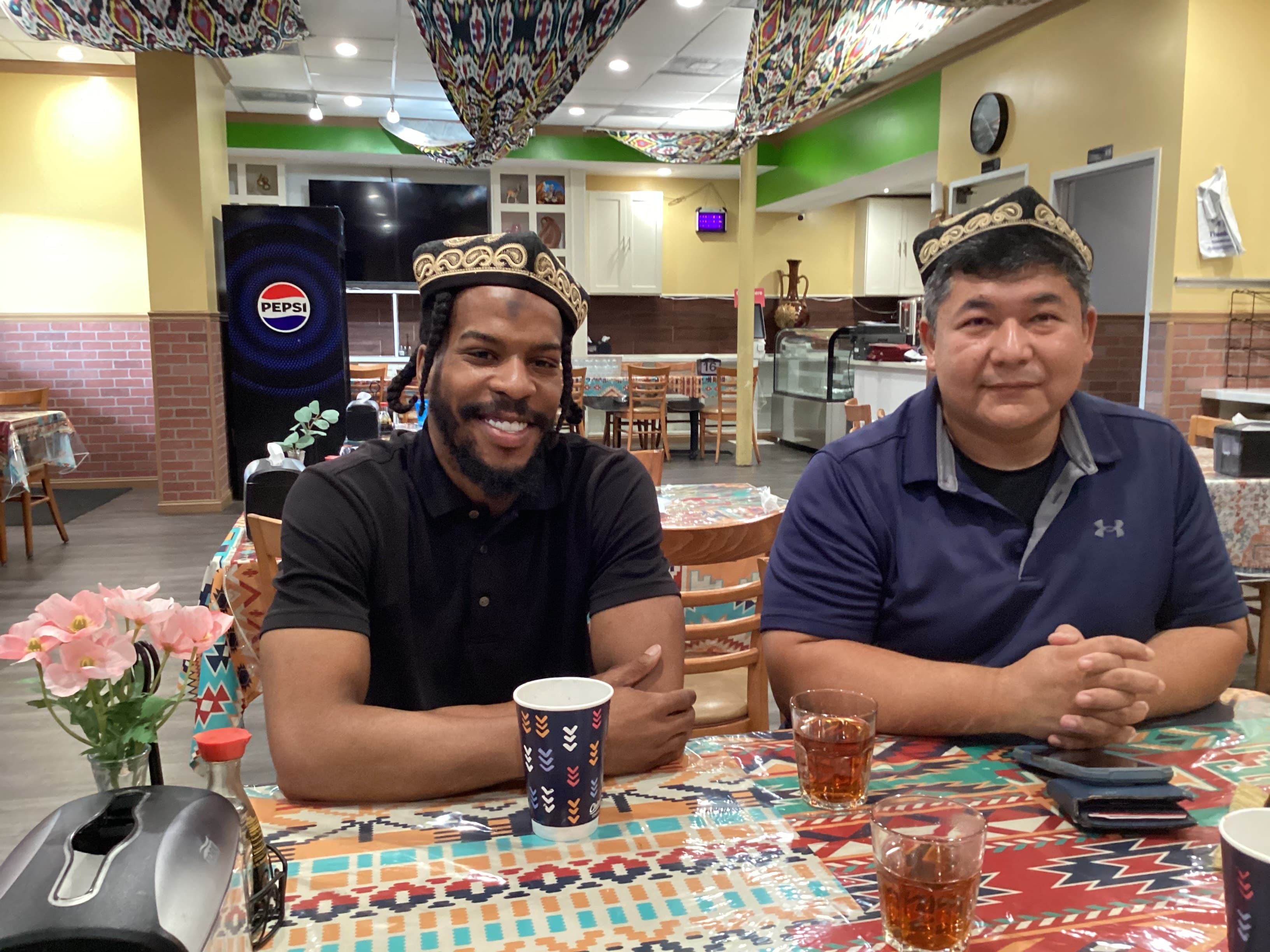 In the middle of that movement, one figure slows the pace. Restaurant manager Luqman Sajad Mohamed, a first-generation American, steps away from his tasks and pauses. Before sitting down, he places an Uyghur doppa on his head, then pours tea and offers it the way Uyghur hospitality is practiced—simply, without announcement. For Mohamed, that small gesture carries meaning. He explains that “trust for gratitude is really important, because in order to see someone, in order to be thankful for someone, you have to trust that their intentions are good.”