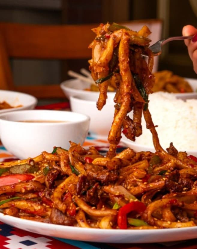 Unlike laghman, where noodles and sauce are served separately, Qorma Chop brings everything together in the pan. The hand-pulled noodles are steam-fried with meat, onions, bell peppers, garlic and chives, absorbing a rich blend of spices. The defining flavor comes from peppercorns—whole and leaf peppercorns fried, dried and ground by hand to create its signature aroma and heat. Photo courtesy of Turan Uyghur Kitchen