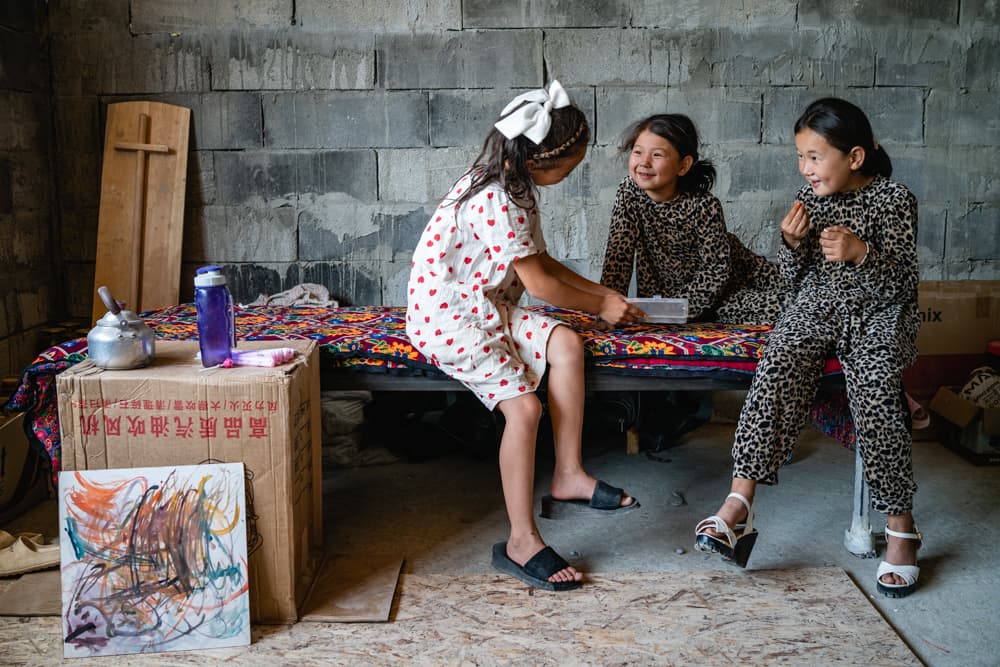 Daniil Usmanov photo in Batken of Nazbiike Nurgazieva for the exhibit Valley of the Winds. Nurgazieva, 8, plays "house" (mothers and daughters) with her friends at home, where she lives with her grandparents in Irilesh village, Kadamjay district. In the scenario of their game, the father has left for work. Photo courtesy of Daniil Usmanov