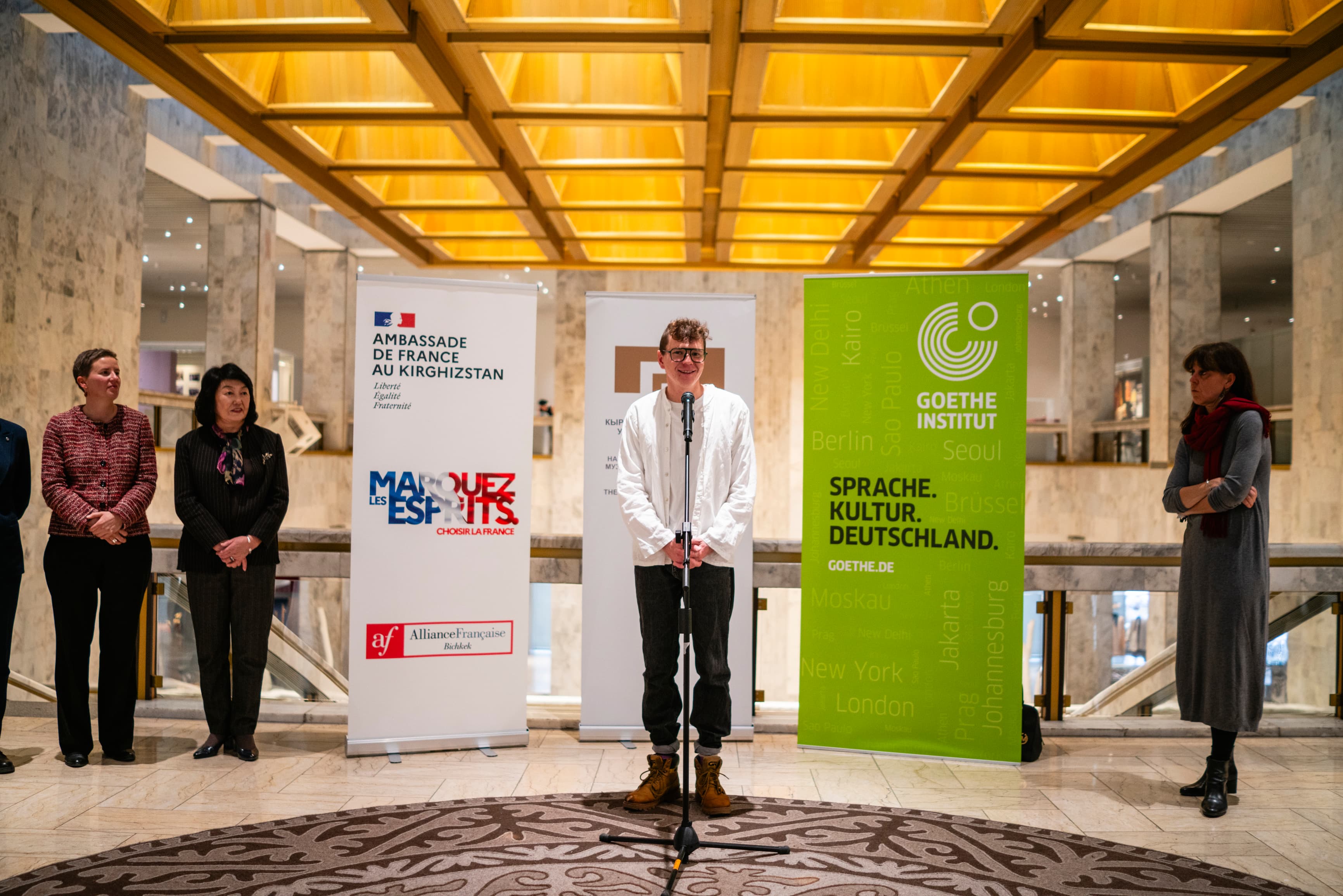 Photographer Daniil Usmanov speaks to attendees of the grand opening of his most-recent exhibition, Valley of the Winds, in Bishkek, Kyrgyzstan. The exhibition, supported by the Embassy of France in Kyrgyzstan and the Goethe Institut, centered on photos by children who were handed disposable cameras to capture life in a community shaped by labor emigration. Photo courtesy of Daniil Usmanov